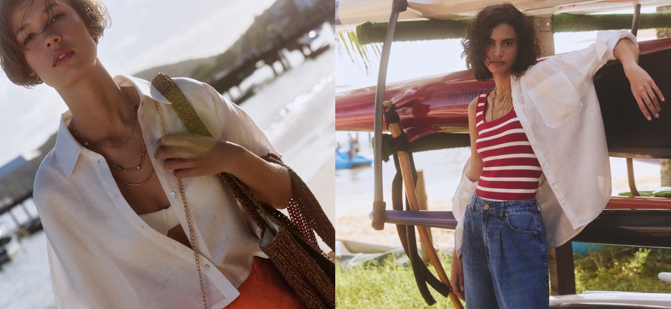 Durante o verão, looks com camisa branca ganham leveza e frescor. Prefira tecidos como algodão ou linho, que são respiráveis e confortáveis. Combine a camisa com shorts de alfaiataria, saias midi estampadas ou até mesmo por cima de biquínis em um looks de praia mais refinado.