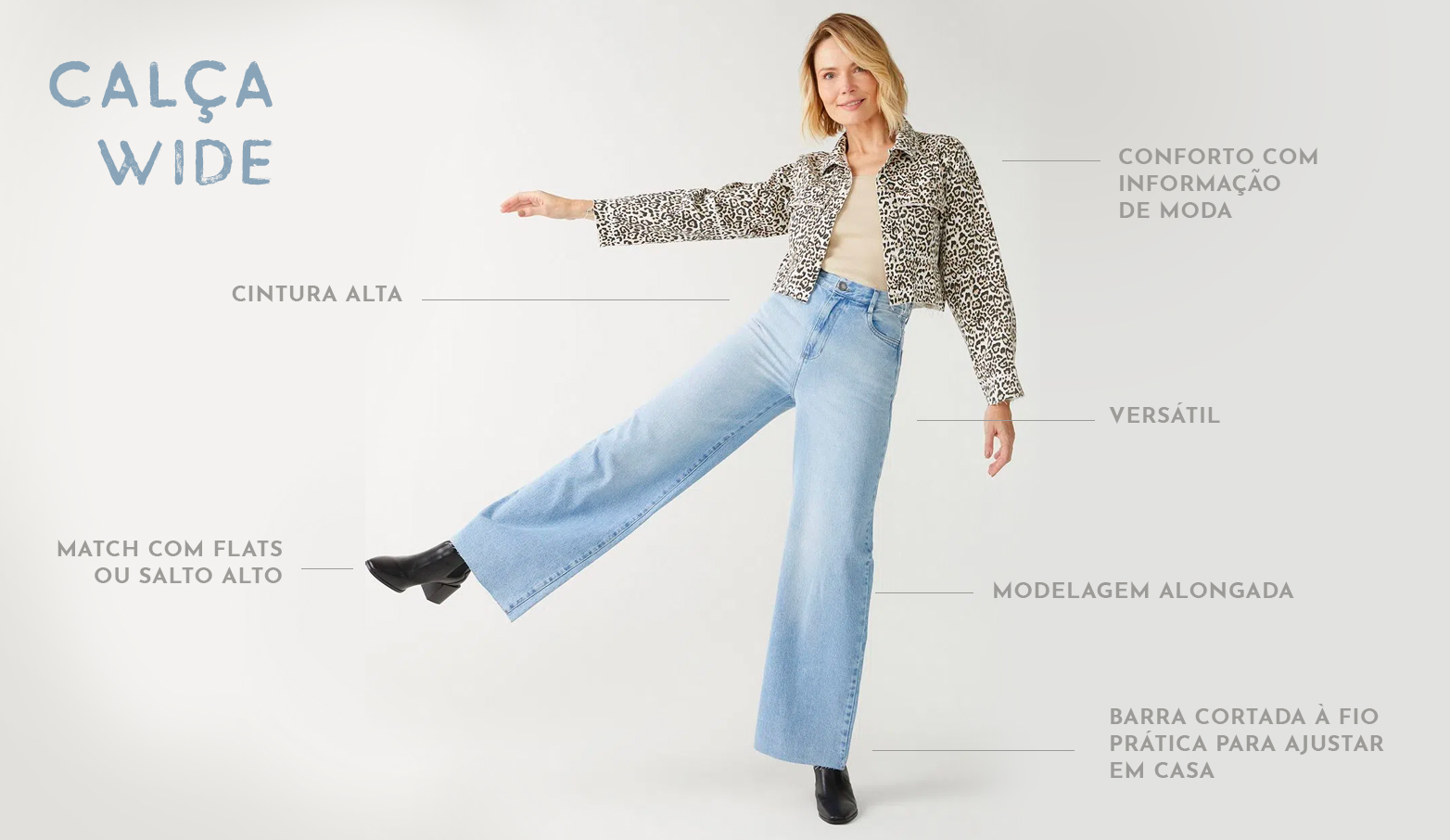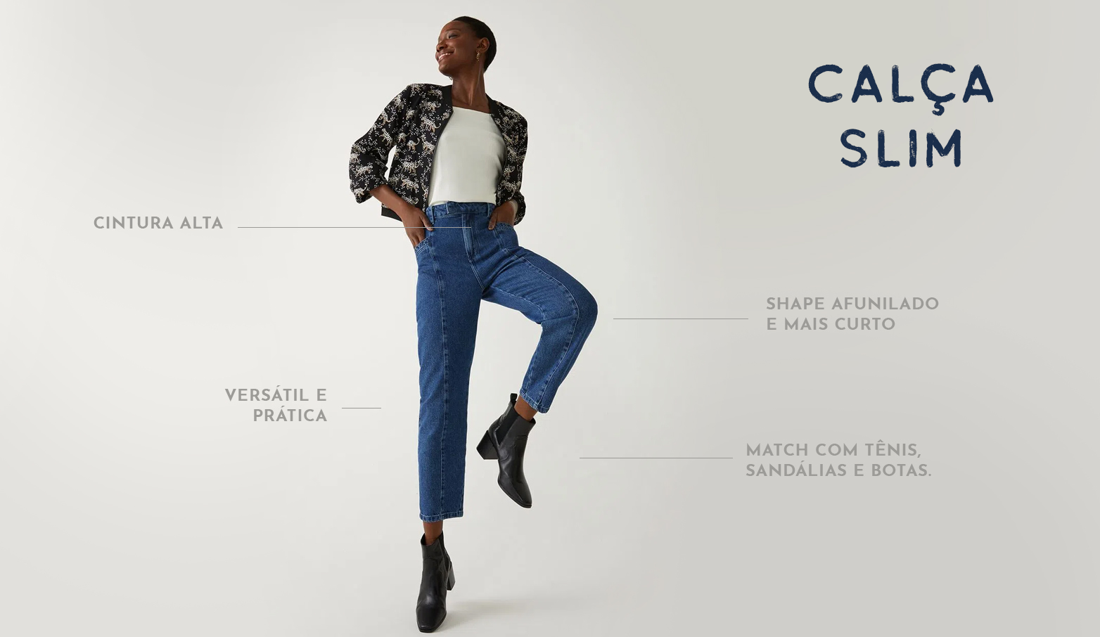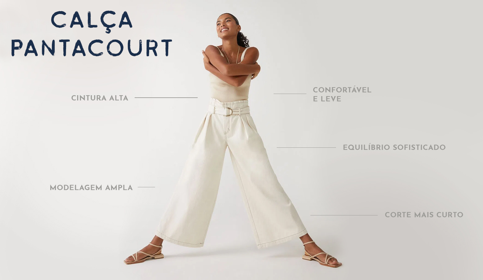 Na Coleção FelizCidade, os shapes clássicos dividem holofotes com as tendências do momento como a calça wide e os modelos com recortes, pregas e cinturas bem marcadas.
