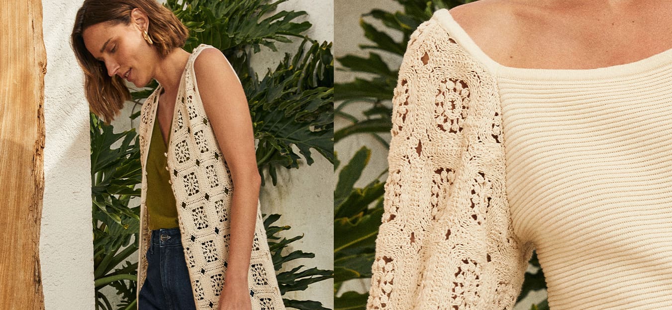 O guipir é uma renda encorpada com fundo vazado, que dá mais contorno aos desenhos e um caimento super charmoso. O colete de guipir alongado já é queridinho absoluto da coleção e uma ótima opção de terceira peça para os dias mais quentes. Já os tops e blusas combinam a textura com o tricot, tirando qualquer look básico do óbvio.