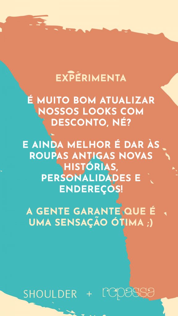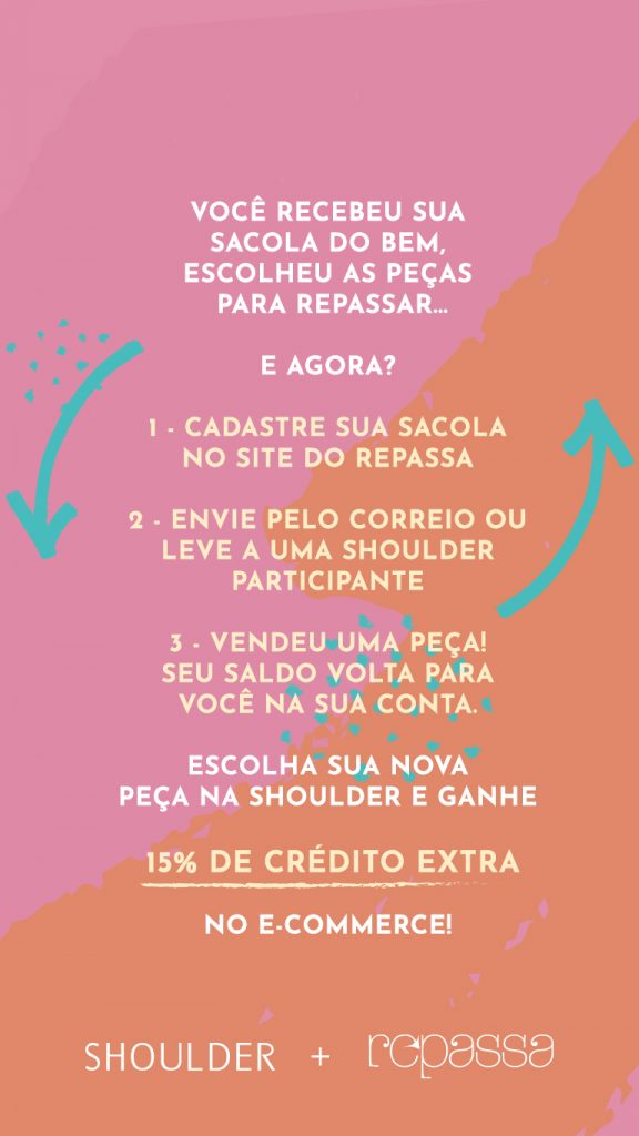 Quer saber como participar desse ciclo? É muito fácil. Vamos distribuir SACOLAS DO BEM em lojas participantes*. A ideia é que, na hora de abrir espaço para novidades no guarda-roupa, você separe peças que não usa mais para vender no Repassa. Depois, o valor da venda pode ser revertido como doação para uma instituição, pode ser depositado na sua conta ou transformado em crédito para novas compras no site da SHOULDER.