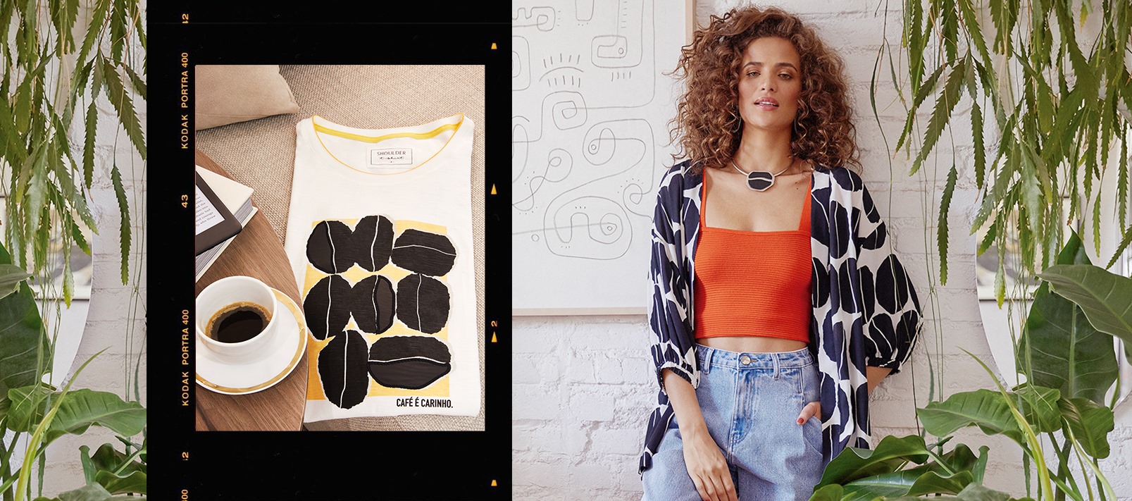 O kimono com estampa de café é um destaque da coleção – perfeito para arrematar o look. Para compor com sofisticação, a dica é adicionar peças alfaiatadas: pode ser uma calça ou bermuda. Já para uma composição mais descontraída durante a semana, que tal apostar no jeans e rasteira?